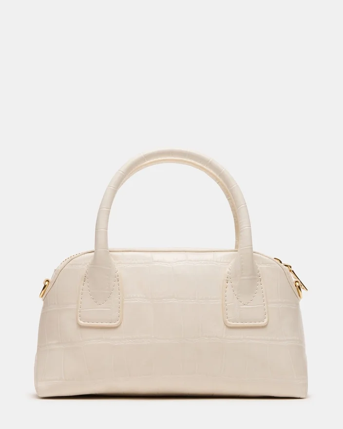 Geanta Melodie din piele de crocodil alb are un mâner superior versatil, combinat cu o curea de umăr detașabilă, pentru o purtare adaptabilă. Îmbogățită cu un fermecător pandantiv detașabil în formă de ursuleț și o eșarfă colorată, aceasta adaugă o notă sofisticată ținutei tale. Păstrează-ți obiectele esențiale în siguranță cu ajutorul închizătorii cu fermoar, în timp ce buzunarul interior de pe peretele din spate oferă spațiu de depozitare organizat pentru obiectele mai mici. Această geantă îmbină accentele elegante cu designul practic, fiind perfectă pentru o utilizare rafinată, de zi cu zi.