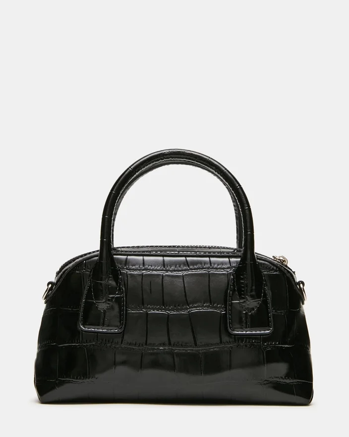 Geanta Melodie din piele de crocodil neagră are un mâner superior versatil, combinat cu o curea de umăr detașabilă, pentru o purtare adaptabilă. Îmbunătățită cu un fermecător pandantiv de geantă în formă de urs detașabil și o eșarfă colorată, aceasta adaugă o notă sofisticată ținutei tale. Păstrează-ți obiectele esențiale în siguranță cu închiderea cu fermoar, în timp ce buzunarul interior de pe peretele din spate oferă spațiu de depozitare organizat pentru obiectele mai mici. Această geantă îmbină accente elegante cu un design practic, fiind perfectă pentru o utilizare rafinată, de zi cu zi.