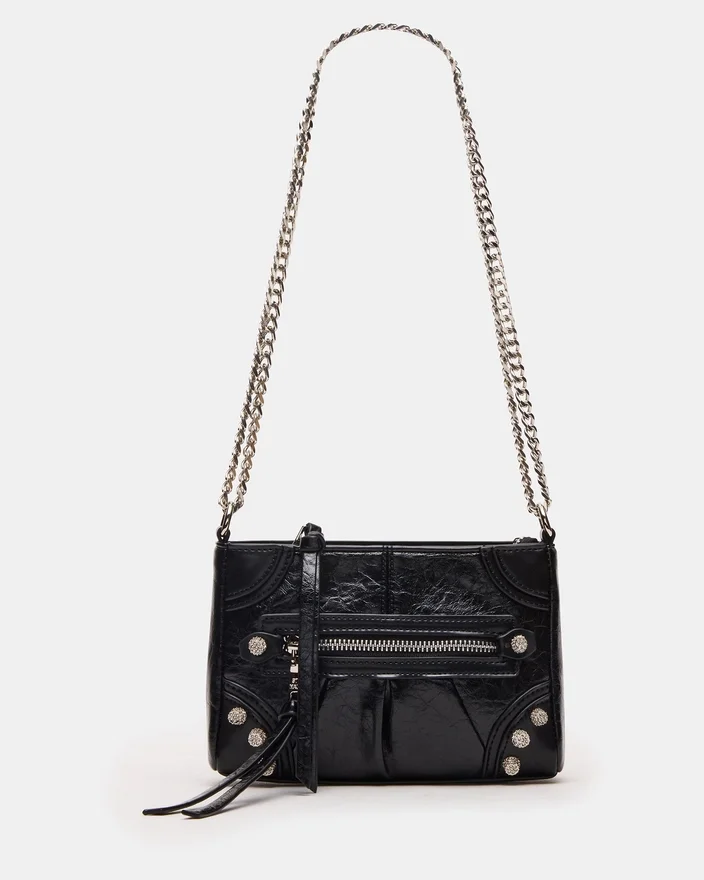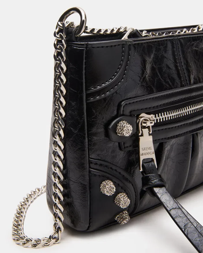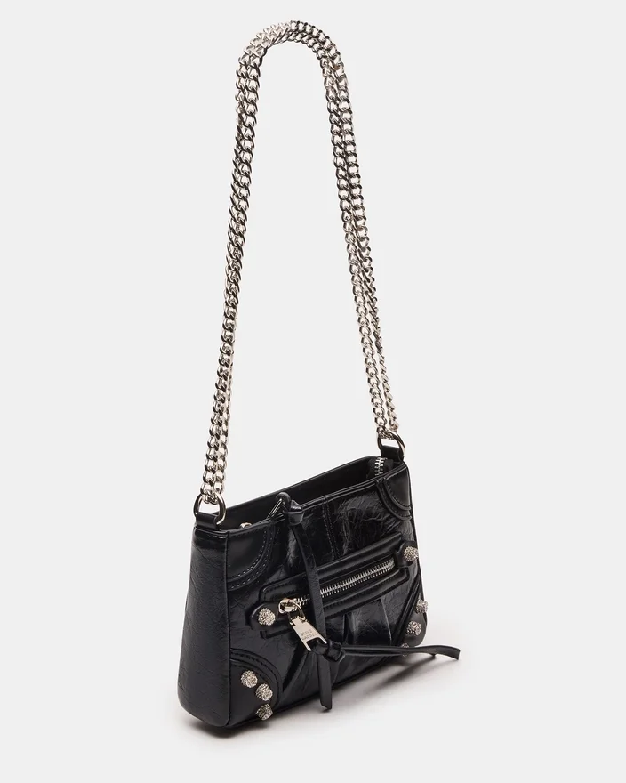 Această geantă Mini Sky Bag Negru/Argintiu este o geantă crossbody inspirată de stilul motociclist, care combină un design îndrăzneț cu detalii rafinate. Cu un corp negru elegant, împodobit cu ținte strălucitoare din strasuri, aceasta adaugă o notă de glamour oricărei ținute. Cureaua cu lanț oferă atât durabilitate, cât și un contrast sofisticat, făcând-o un accesoriu ideal pentru confortul de a avea mâinile libere, fără a face compromisuri în ceea ce privește stilul. Perfectă pentru a transporta obiectele esențiale cu un aer modern și avangardist.<!–