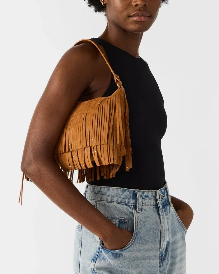 • Geantă cu curea de umăr, franjuri și ținte