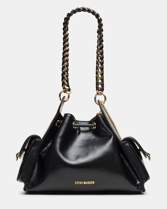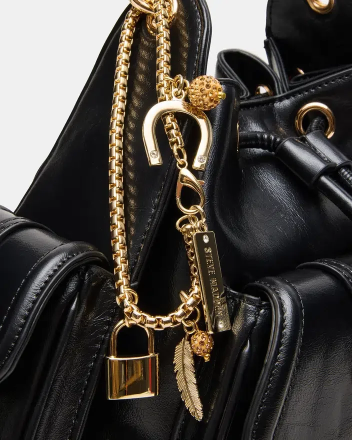 Geanta Dru Bag Black îmbină rafinamentul structurat cu stilul boem. Această geantă cu formă de găleată are un buzunar funcțional cu clapă în față și o curea reglabilă cu lanț, pentru o purtare versatilă. Elementul care o face să iasă în evidență este colecția de brelocuri boho detașabile – potcoavă, pană și lacăt – care îți permit să-ți personalizezi look-ul și să-ți exprimi stilul personal. Perfectă pentru cei care apreciază atât eleganța, cât și personalitatea în accesoriile lor de zi cu zi.