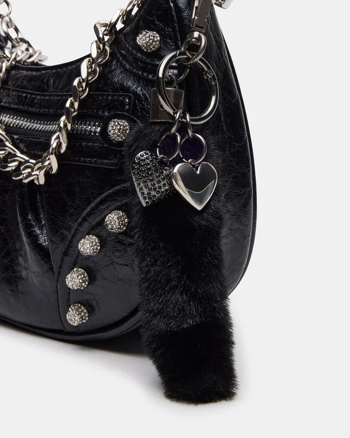 Geanta Erika combină eleganța îndrăzneață cu un design practic. Prezentând strasuri pavate cu ținte, această geantă crossbody cu textură șifonată adaugă o notă de strălucire oricărei ținute. Cureaua de umăr cu lanț oferă un aspect elegant, în timp ce cureaua crossbody detașabilă și reglabilă asigură o purtare personalizabilă. Un breloc detașabil adaugă un stil personalizat, iar închiderea cu fermoar în partea de sus oferă acces sigur și ușor la obiectele esențiale. Perfectă pentru a fi purtată atât ziua, cât și seara, această geantă echilibrează detaliile elegante cu versatilitatea funcțională.