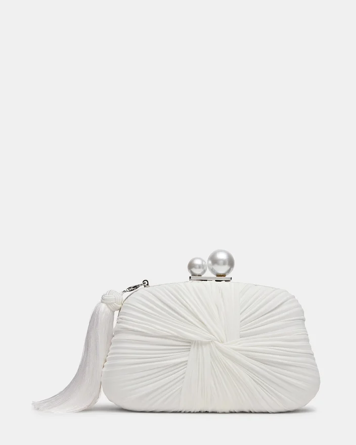 Geanta Rosalie Albă combină eleganța arhitecturală cu măiestria rafinată. Această poșetă structurată în formă de clepsidră are un cadru metalic și țesătură de mătase plisată Micro Plissa, strânsă manual, accentuată de un motiv răsucit central impresionant. O ciucure albă de lux detașabilă, cu capăt împletit și închidere asimetrică cu perle, adaugă un detaliu sofisticat. Mecanismul intuitiv push-pull asigură accesul fără efort, în timp ce sloturile interioare pentru carduri mențin lucrurile esențiale organizate. Treceți fără probleme de la zi la seară cu cureaua detașabilă cu lanț inclusă, care oferă opțiuni versatile de stil pentru orice ocazie.