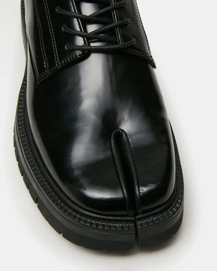 Modelul Jaxel Black Box combină designul contemporan cu măiestria tradițională, prezentând o siluetă distinctivă cu vârful despicat. Acești pantofi eleganți pentru bărbați, cu șireturi, îmbină stilul Tabi cu croiala rafinată, oferind o alternativă îndrăzneață pentru cei care caută încălțăminte cu design arhitectural. Construcția structurată și materialele de calitate superioară oferă atât impact vizual, cât și confort de durată, făcându-i alegerea ideală pentru profesioniștii pasionați de modă.