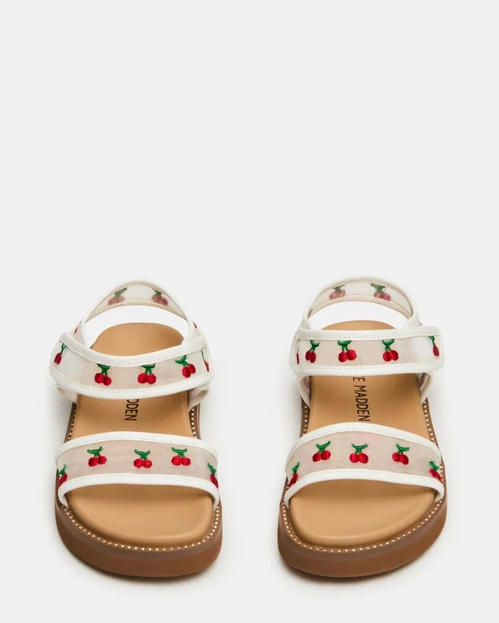 Vă prezentăm modelul Lyla White pentru copii mici — o sandală jucăușă, concepută pentru micii exploratori. Cu detalii brodate fermecătoare în formă de cireșe și o structură din plasă respirabilă, această sandală asigură confortul piciorușelor toată ziua. Curelele reglabile cu velcro asigură o potrivire sigură și personalizabilă, care crește odată cu copilul dumneavoastră. Perfectă pentru aventurile pe vreme caldă, de la zile petrecute în parc până la ieșiri Casual.