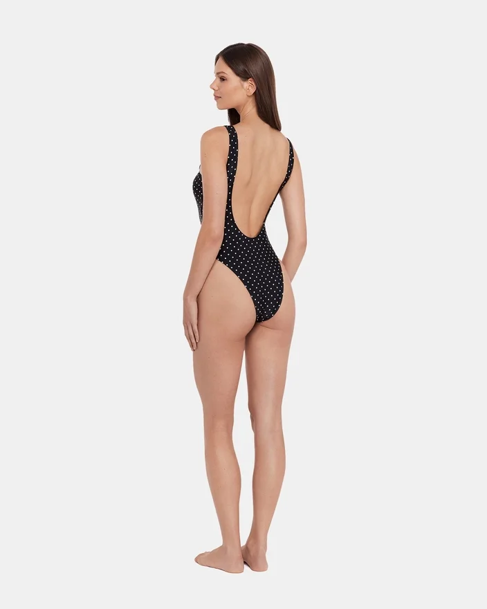 Costumul de baie întreg Darling Dot negru cu imprimeu multicolor oferă un aspect sofisticat, cu accente delicate de perle care îți pun în valoare ținuta la piscină. Cu o croială îndrăzneață și decupaje laterale elegante, acest model echilibrează acoperirea cu un stil modern. Perfect pentru persoanele care caută o piesă de efect care combină eleganța cu costumele de baie contemporane.