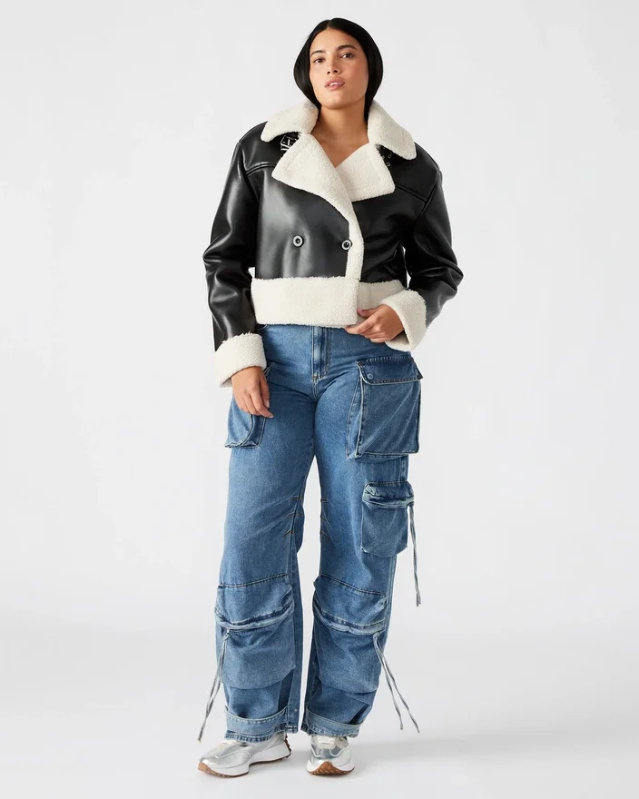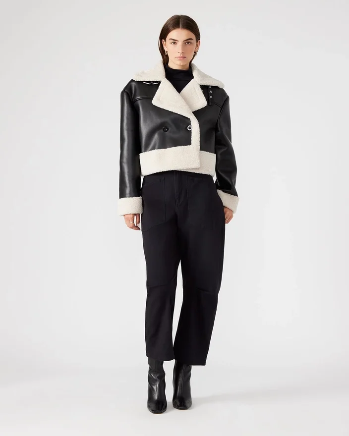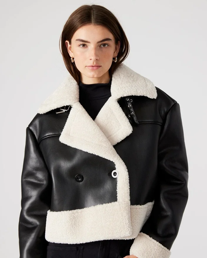Realizată cu măiestrie, jacheta Athen este o piesă atemporală care oferă atât stil, cât și funcționalitate. Designul cu două rânduri de nasturi adaugă o notă elegantă, în timp ce croiala oversized și lungimea scurtă conferă un aer modern. Garnitura din imitație de blană nu numai că adaugă textură, dar oferă și căldură. Cureaua funcțională de la guler și nasturii de fixare fac din această jachetă o alegere practică pentru orice ocazie.