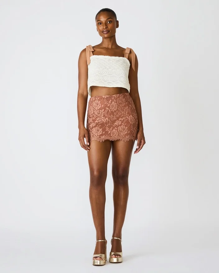 Îmbunătățește-ți stilul de seară cu fusta Cindi Mocha Heather. Această fustă are un design din dantelă pe toată suprafața. Oferă o ținută coordonată și la modă, perfectă pentru ocazii speciale sau ieșiri în oraș. Finisajul luxos al fustei și stilul fluid și atrăgător, păstrând în același timp confortul purtării.