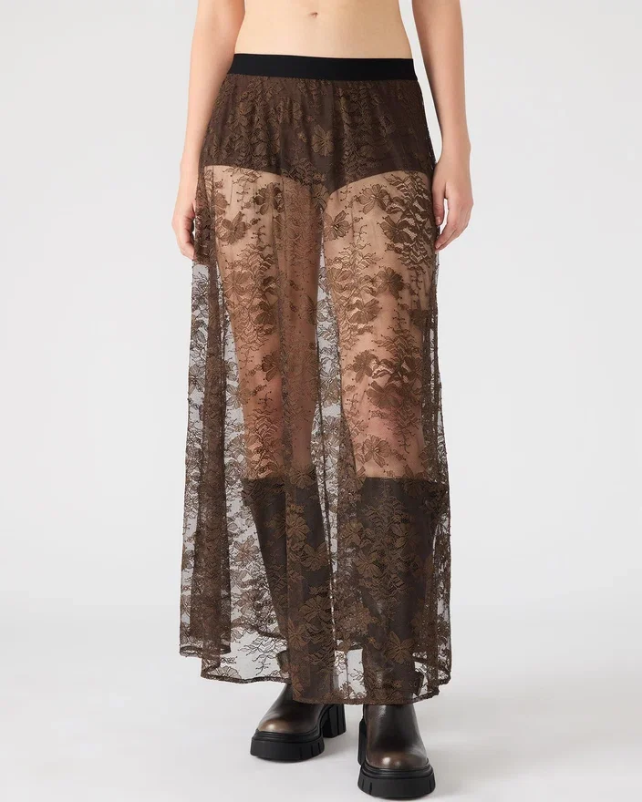 Îmbogățiți-vă garderoba cu fusta Gisela, o fustă lungă din dantelă transparentă care combină eleganța cu rafinamentul modern.
