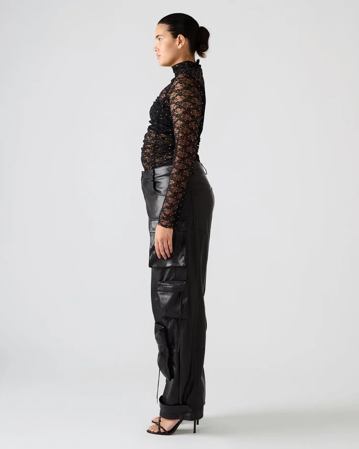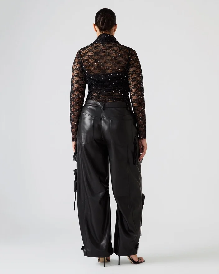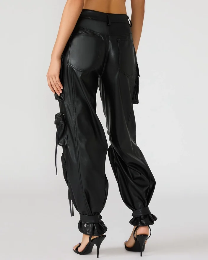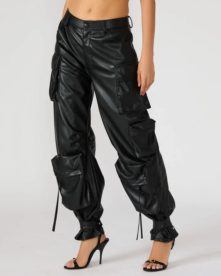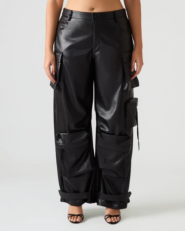 Concepute cu măiestrie pentru o croială structurată și voluminoasă, pantalonii Duo din piele vegană, negri, sunt confecționați din materiale de calitate. Cu curele reglabile la gleznă, acești pantaloni cargo cu croi larg oferă o siluetă versatilă care poate fi ușor personalizată după preferințele tale.