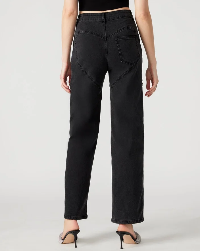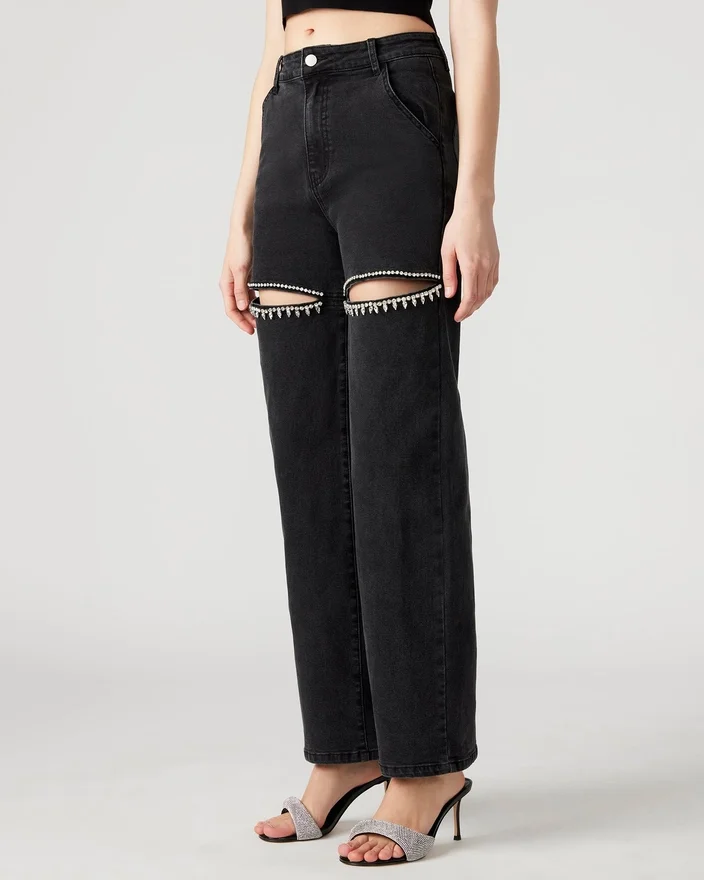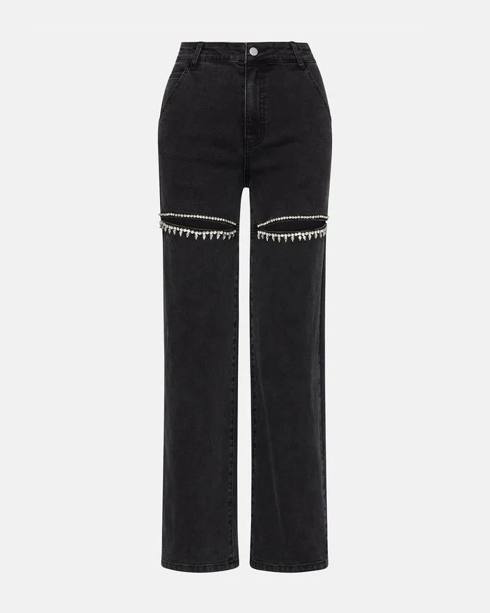 Blugii Taylor oferă o variantă stilată a unui design clasic. Cu o croială largă, acești blugi oferă confort și versatilitate, în timp ce decupajele complexe cu strasuri de pe coapse adaugă o notă de glamour.