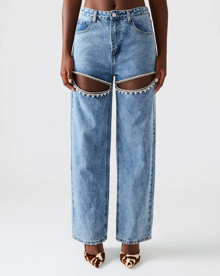 - Blugi cu croială largă și decupaje ornamentate