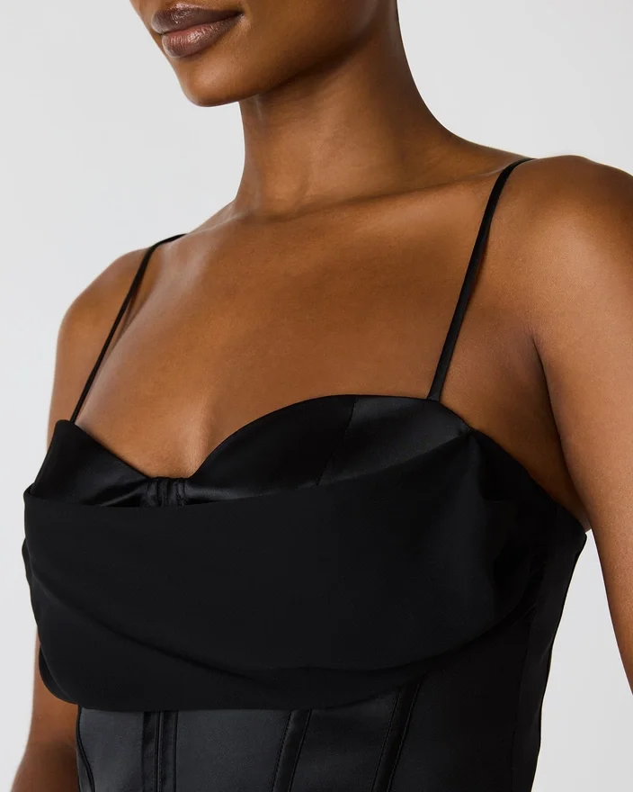 Rochia Carmela neagră combină eleganța atemporală cu rafinamentul modern. Confecționată din țesătură de satin luxoasă, această rochie maxi are un corset structurat care oferă susținere și contur avantajos. Bretelele reglabile permit o potrivire personalizată, în timp ce închiderea convenabilă cu fermoar în spate asigură o îmbrăcare fără efort.