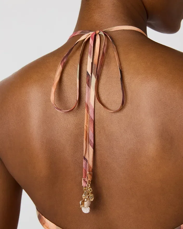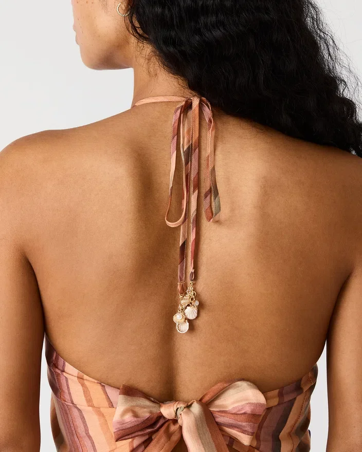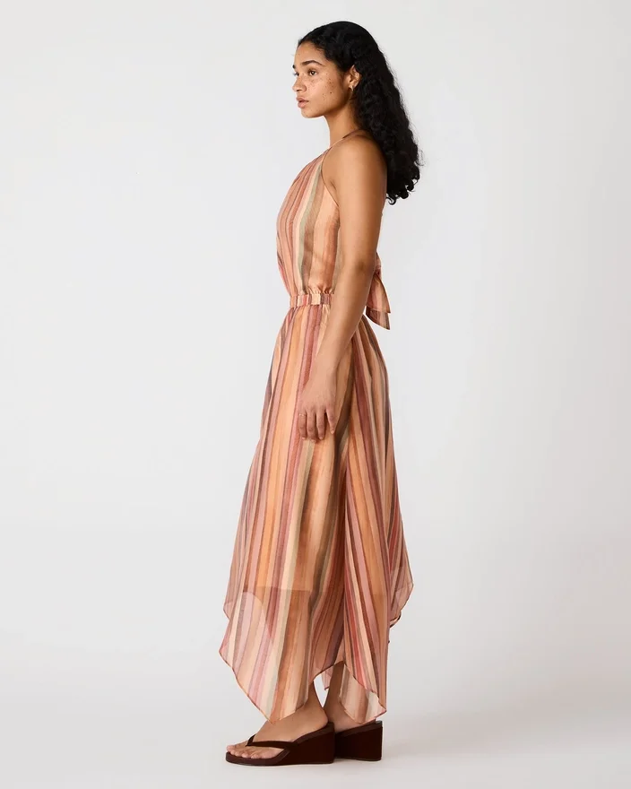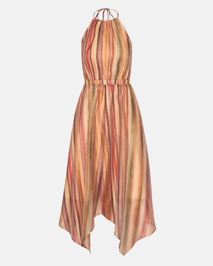 Rochia Dalina cu dungi multicolore are un decolteu grațios în stil halter care încadrează elegant umerii, oferind în același timp opțiuni versatile de styling. Detaliile cu dungi verticale într-o paletă multicoloră adaugă interes vizual și mișcare siluetei.