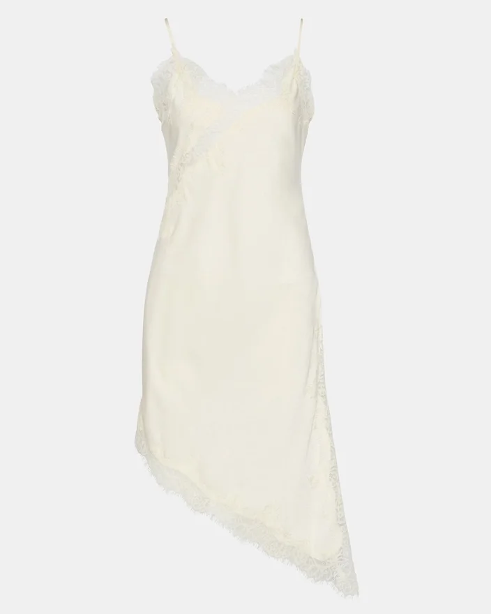 Rochia Danna crem combină eleganța naturală cu detalii de design moderne. Această rochie midi fără mâneci are o bordură delicată din dantelă care adaugă o textură rafinată, în timp ce croiala asimetrică creează un efect vizual interesant și mișcare. Bretelele reglabile asigură o potrivire personalizată pentru toate tipurile de siluetă.