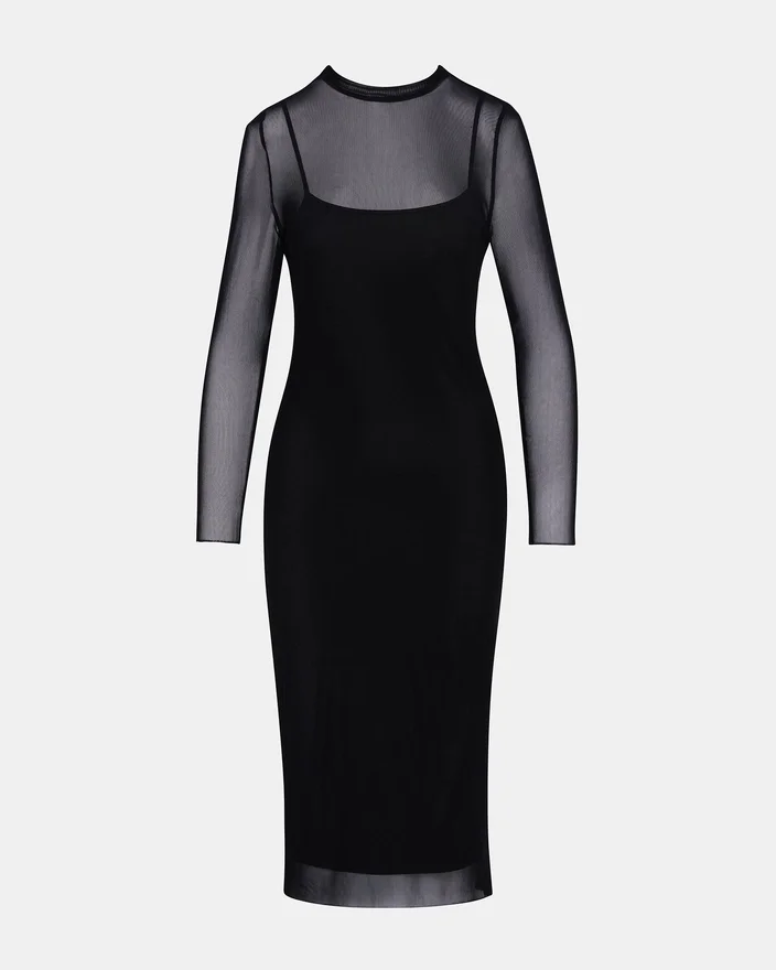 Rochia Hailee este o piesă sofisticată de lungime medie, confecționată din țesătură transparentă din plasă, cu mâneci lungi și guler înalt rafinat. Designul său echilibrează eleganța cu un stil modern, făcând-o ideală pentru evenimente de seară elegante sau reuniuni de lux. Plasa respirabilă asigură confortul, menținând în același timp o siluetă elegantă, oferind un aspect plin de încredere și rafinat.