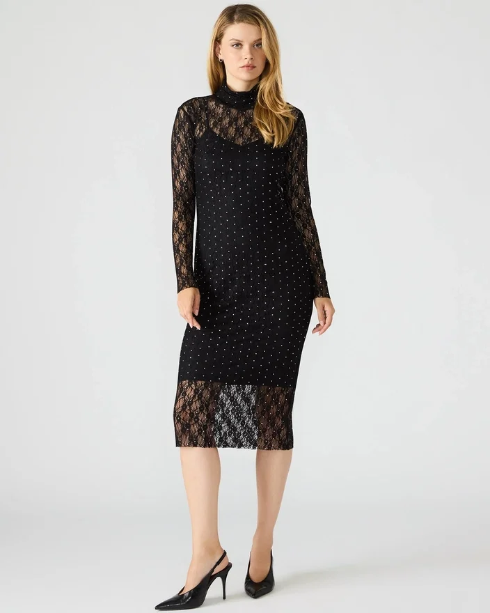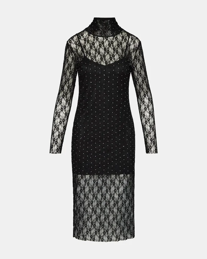 Rochia din dantelă cu ținte Vivienne, neagră, are un strat exterior din plasă transparentă, căptușită, de lungime medie, cu guler înalt și mâneci cu orificii pentru degete.