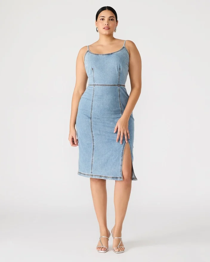 • Rochie midi din denim, mulată, cu fante