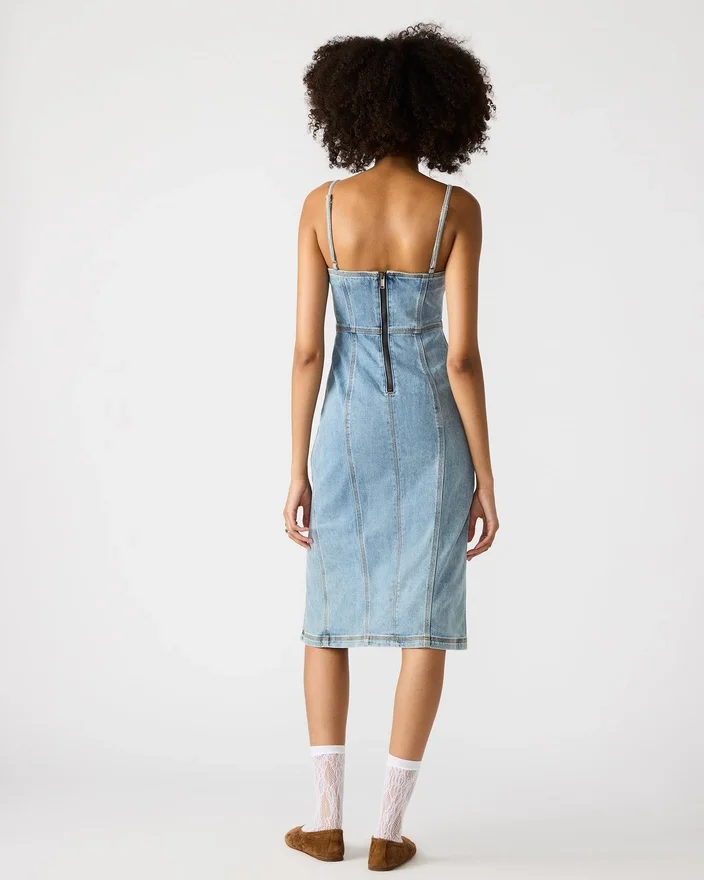 Îmbunătățește-ți garderoba cu rochia Giselle. Această rochie midi ajustată are bretele reglabile și o închidere cu fermoar la spate pentru o potrivire perfectă. Confecționată din denim albastru de înaltă calitate, această rochie este atât elegantă, cât și confortabilă.