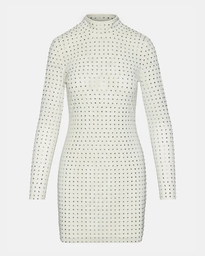 Îmbunătățește-ți stilul cu rochia noastră Krista. Această rochie mini cu mâneci lungi are guler înalt și închidere cu fermoar în spate. Această rochie uimitoare are, de asemenea, ornamente unice cu strasuri în formă de pătrat, pentru un plus de glamour. Fă o impresie cu această piesă elegantă și sofisticată, perfectă pentru orice ocazie.