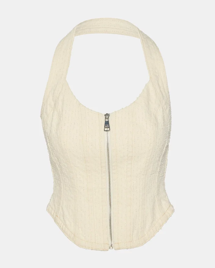 Topul corset Natasha Natural prezintă o siluetă bustieră structurată, cu un decolteu halter flatant, care oferă susținere și definiție. Închiderea cu fermoar în față permite o îmbrăcare ușoară și ajustabilitate, făcându-l versatil pentru a fi purtat în straturi sau ca piesă de efect. Realizat cu croială de precizie, acest top corset oferă un look rafinat și la modă, care se potrivește perfect atât pentru ținutele de zi, cât și pentru cele de seară.