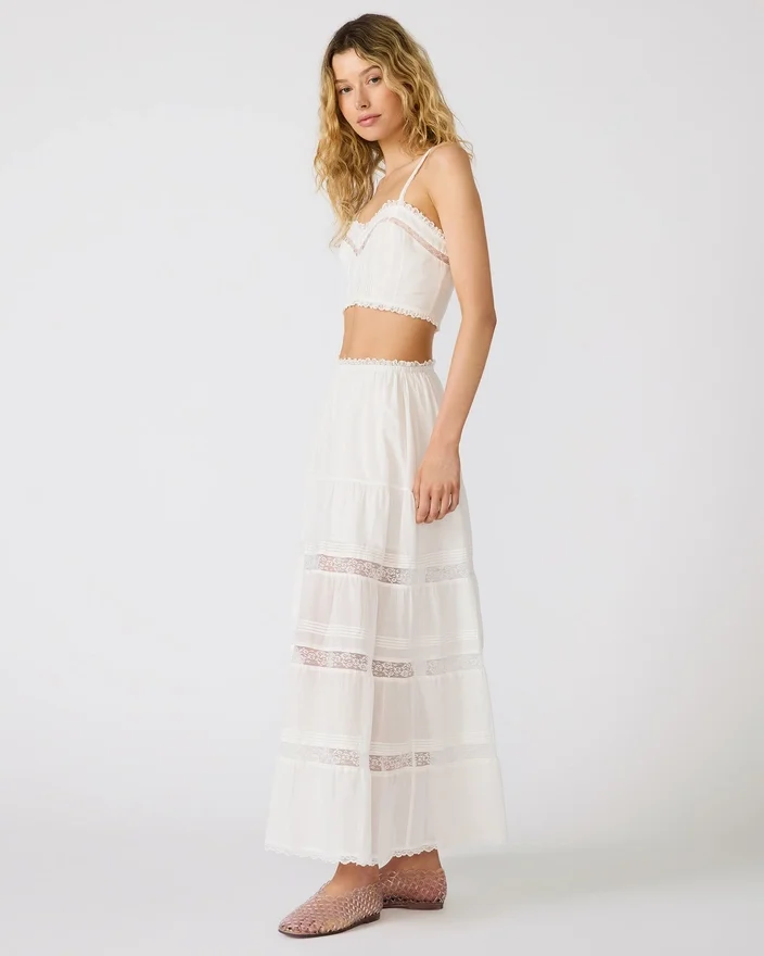 Topul Elisse Antique prezintă un decolteu elegant în formă de inimă care pune în valoare decolteul, în timp ce detaliile delicate din dantelă adaugă un plus de rafinament romantic. Această siluetă scurtă oferă o interpretare modernă a designului de inspirație vintage, perfectă pentru a fi purtată în straturi sau singură.