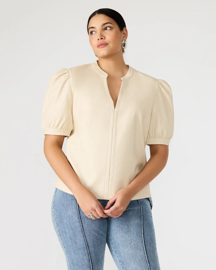 Topul Jane se mândrește cu un design contemporan, cu o notă de feminitate. Țesătura sa moale din imitație de piele conferă structură acestui pulover cu mâneci scurte bufante. Gulerul în V despicat și umerii bufanți pe jumătate completează aspectul său elegant și rafinat.