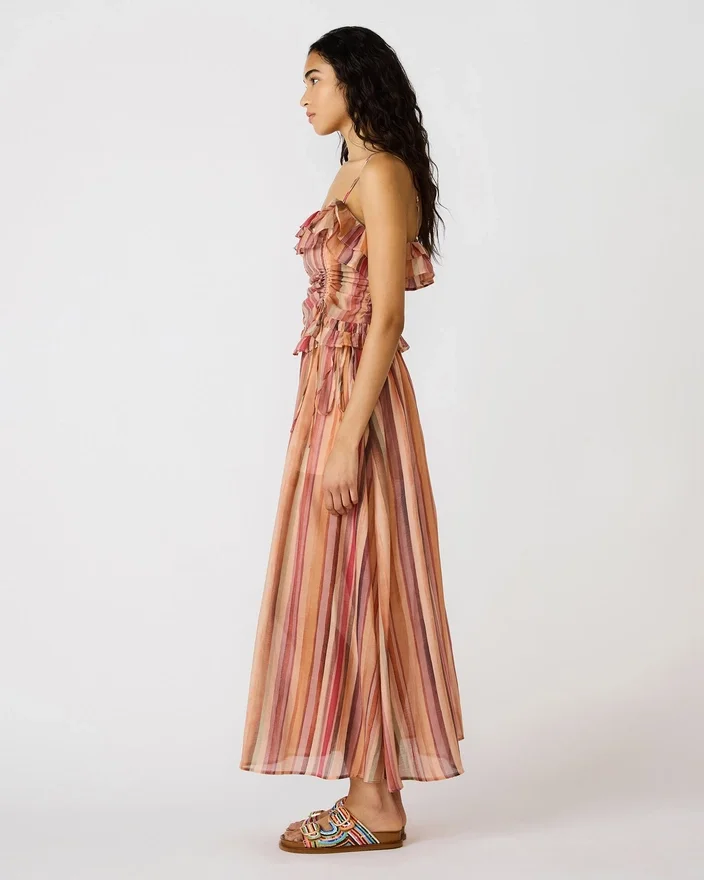 Topul Shilloh Stripe Multi combină designul contemporan cu detalii jucăușe. Această siluetă fără mâneci prezintă dungi multicolore vibrante care creează un efect vizual interesant, în timp ce accentele delicate de volane adaugă dimensiune și mișcare. Croiala expertă asigură o potrivire elegantă care trece fără probleme de la zi la seară.
