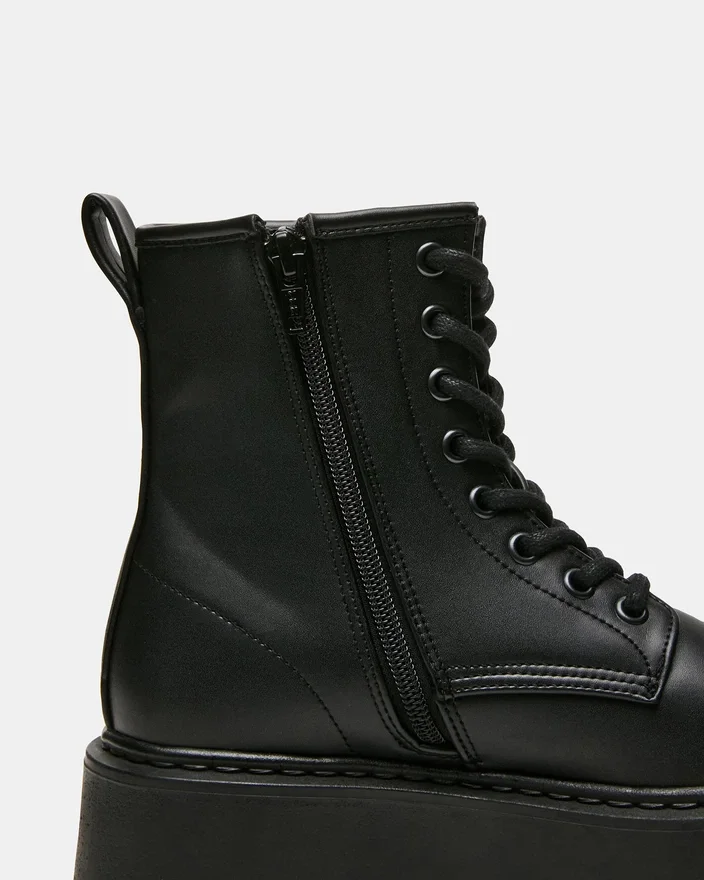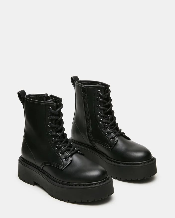 Botinea de luptă Buffy Black oferă stil cu o notă rafinată. Aceste botine cu șireturi până la gleznă au o siluetă structurată care atrage atenția, indiferent dacă sunt asortate cu ținute îndrăznețe sau cu blugi.