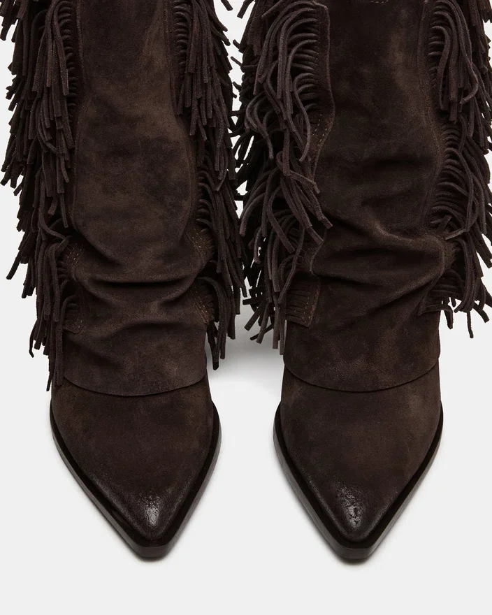 Botinele Landmark din piele de căprioară maro pun în valoare măiestria artizanală cu o influență de Stil Western îndrăzneață. Cu accente elegante de franjuri, detalii cu ținte și o siluetă cu manșetă, aceste botine oferă un look distinctiv. Vârful ascuțit le accentuează profilul elegant, făcându-le alegerea ideală pentru cei care caută o combinație versatilă de personalitate și rafinament.