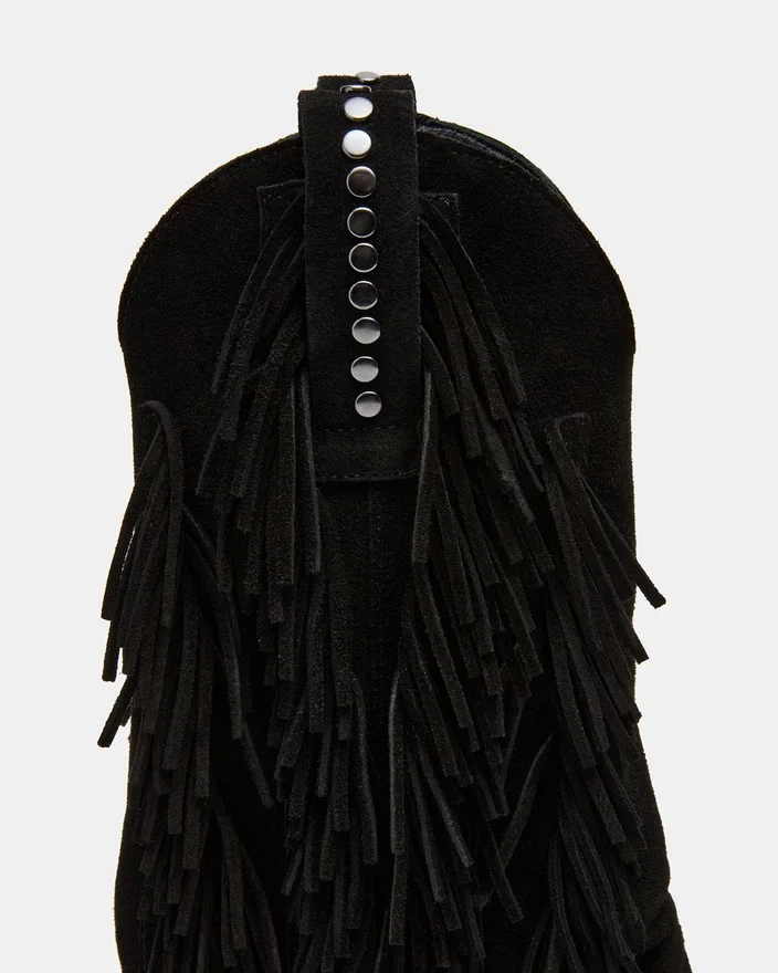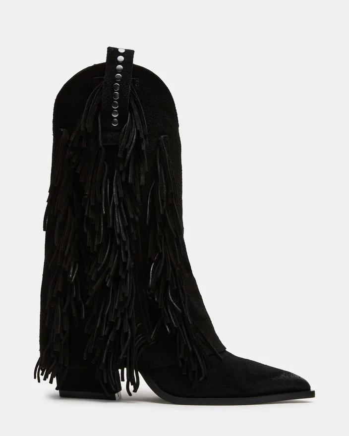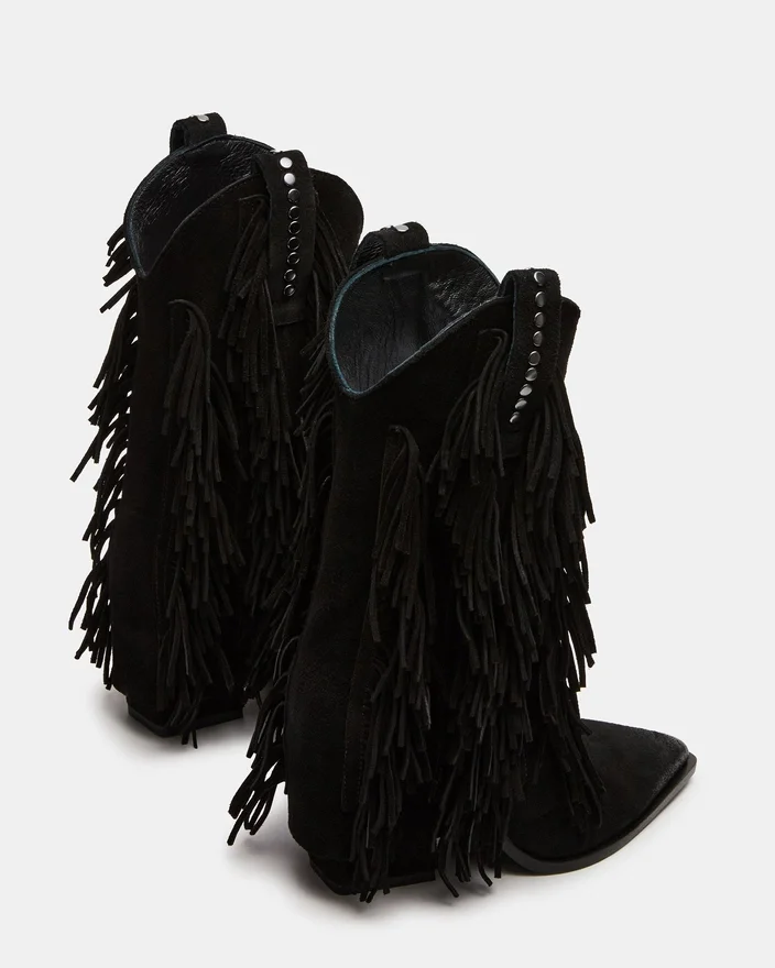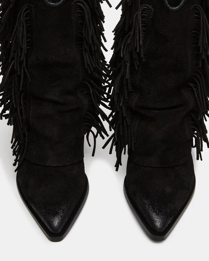 Botinele Landmark din piele de căprioară neagră pun în evidență măiestria artizanală cu un Stil Western îndrăzneaț. Cu accente elegante de franjuri, detalii cu ținte și o siluetă cu manșetă, aceste botine oferă un aspect distinctiv. Vârful ascuțit le accentuează profilul elegant, făcându-le alegerea ideală pentru cei care caută o combinație versatilă de personalitate și rafinament. Dacă vă aflați între două mărimi, alegeți o jumătate de mărime mai mică