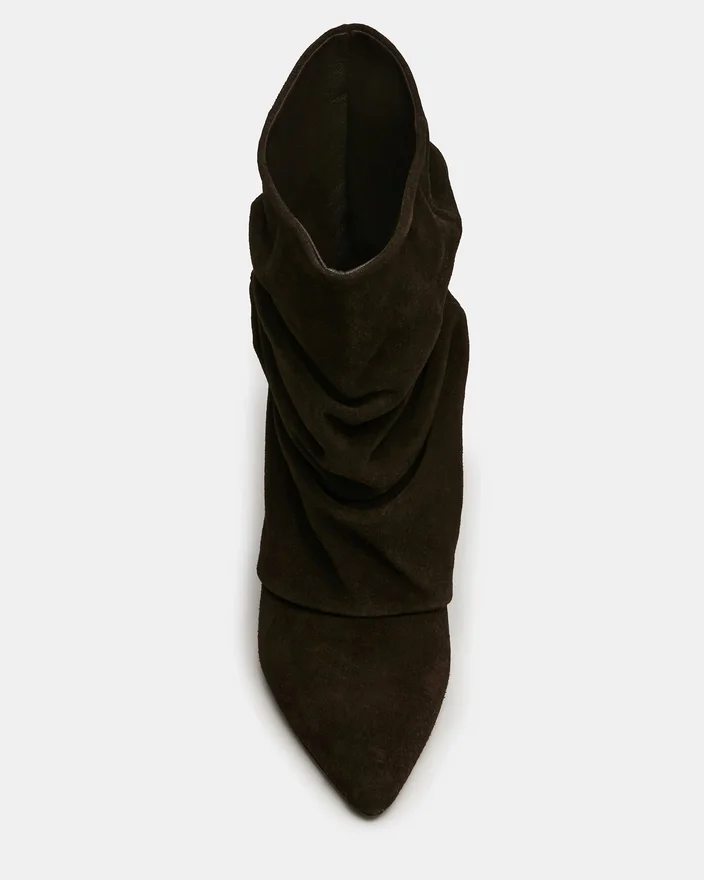 Botinele Lexen din piele de căprioară maro oferă un stil sofisticat prin designul lor distinctiv. Vârful ascuțit creează o siluetă alungită care flatează piciorul, în timp ce manșeta pliată caracteristică adaugă un element arhitectural interesant și opțiuni versatile de stilizare.