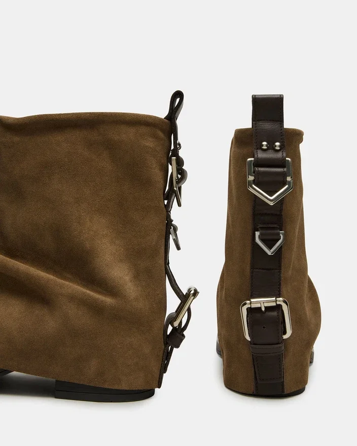 Ghetele Benji prezintă un design sofisticat cu manșetă rabatabilă, combinat cu o siluetă elegantă inspirată de stilul motociclist. Detaliul unic al cataramei din spate adaugă un plus de personalitate, îmbinând stilul cu funcționalitatea subtilă. Realizate atât pentru confort, cât și pentru a face o declarație de stil, aceste botine completează orice ținută cu măiestrie și un stil contemporan.