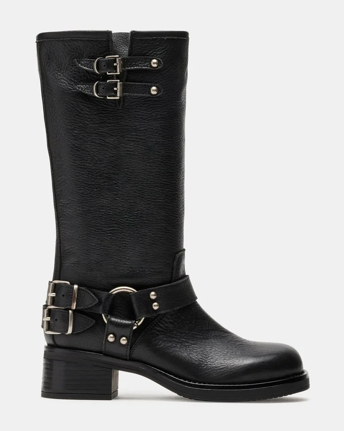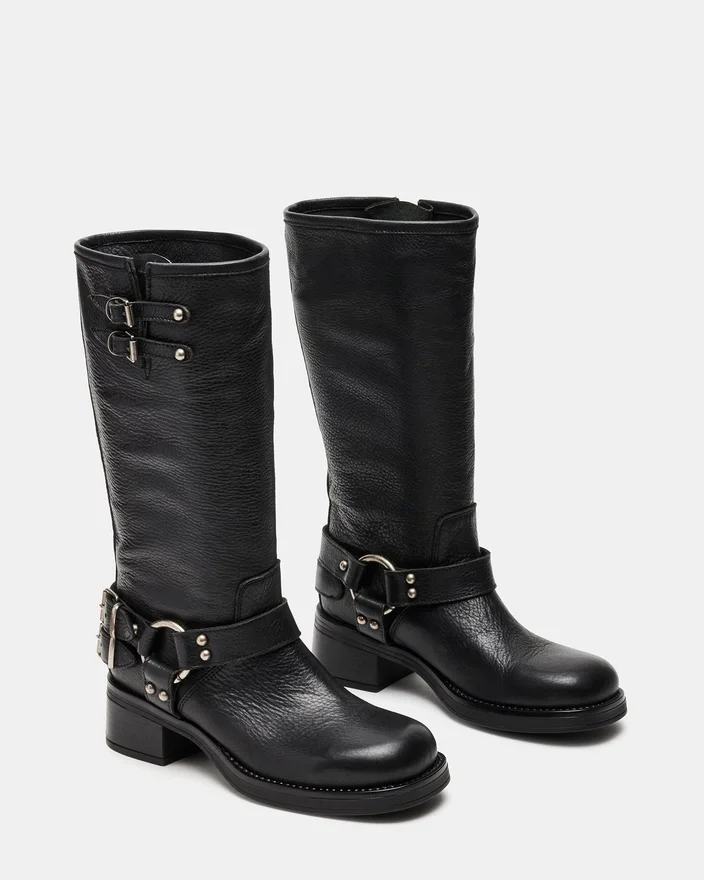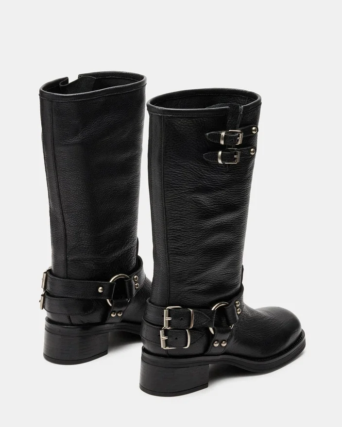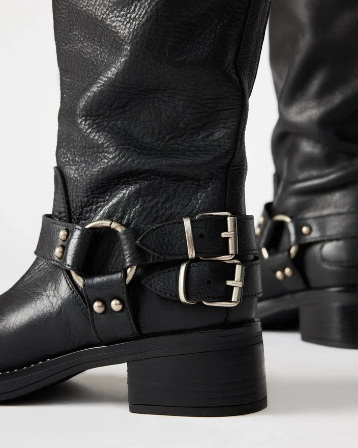 Cizma Astor cu vârf pătrat prezintă o siluetă lejeră până la jumătatea gambei, întărită cu accente de curele și accesorii metalice solide. O talpă lată cu toc gros oferă o bază solidă pentru acest design inspirat de cizmele de inginer.