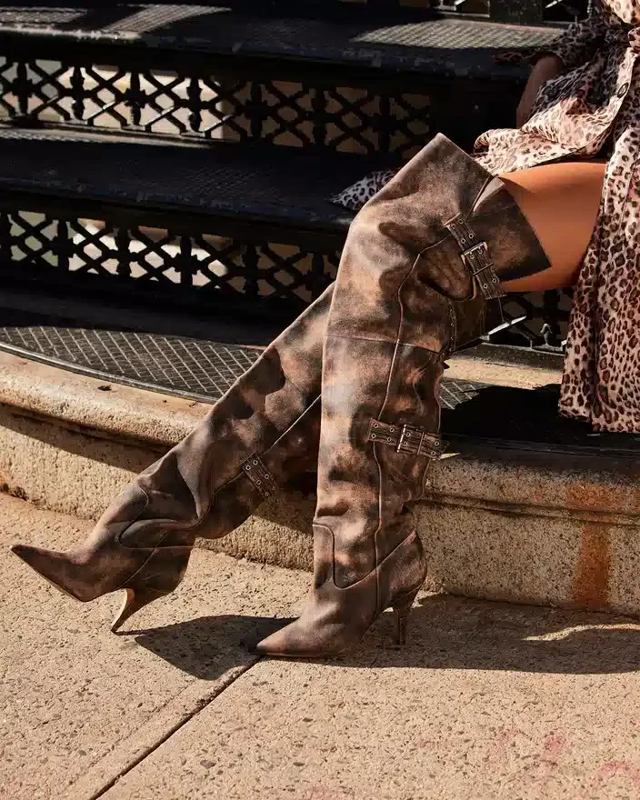 Realizate cu măiestrie, cizmele Baddie sunt atât îndrăznețe, cât și practice. Confecționate cu vârf ascuțit și detaliu cu cataramă, aceste cizmele cu pantofi cu toc peste genunchi oferă o notă unică oricărei ținute. Îmbunătățiți-vă stilul cu aceste cizmele care nu trec neobservate.