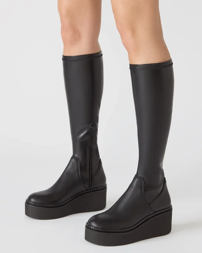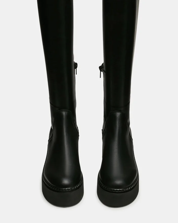 Această cizmă până la genunchi Draco Black combină designul arhitectural cu funcționalitatea practică. Vârful rotunjit creează o siluetă rafinată, în timp ce talpa cu platformă oferă înălțime și confort sporit pentru purtare îndelungată. Realizată cu măiestrie de precizie, oferă estetica rafinată și suportul structural care îmbunătățesc orice garderobă.