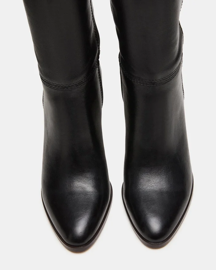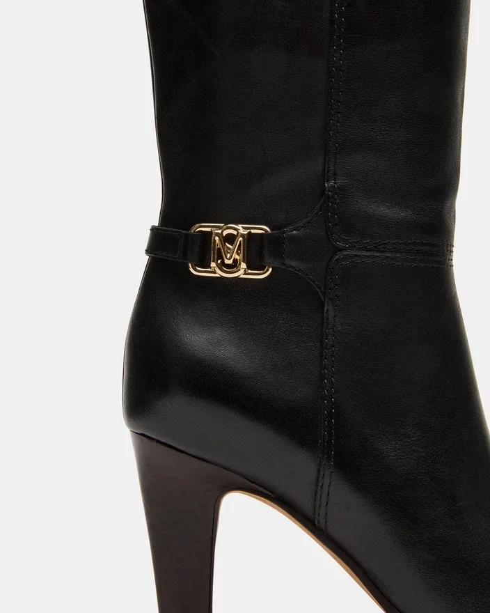 Aceste cizme din piele neagră Rhett, până la genunchi, combină materialul elegant cu un detaliu sofisticat de cataramă aurie, oferind o siluetă rafinată, pusă în valoare de un toc stabil. Concepute atât pentru stil, cât și pentru confort, ele oferă un aspect plin de încredere și elegant, perfect pentru a completa orice ținută.