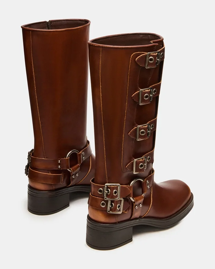 Cizmea până la genunchi Rocky Cognac Distressed are profilul larg al unei cizme de inginer, cu curele și catarame care adaugă un aspect industrial și conferă designului o potrivire ajustabilă.