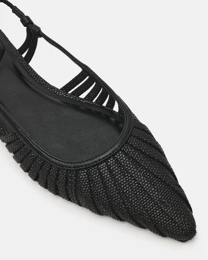 Alandria Black Raffia este o pereche sofisticată de pantofi fără toc, cu vârf ascuțit, care combină eleganța atemporală cu confortul modern. Construcția țesută asigură o structură respirabilă, în timp ce designul cu pantofi decupați la spate oferă un sprijin sigur. Perfect pentru trecerea de la birou la ținutele de seară, acest model versatil se asortează fără efort cu rochii, pantaloni sau ținute Casual. Un element esențial rafinat pentru o garderobă exigentă.