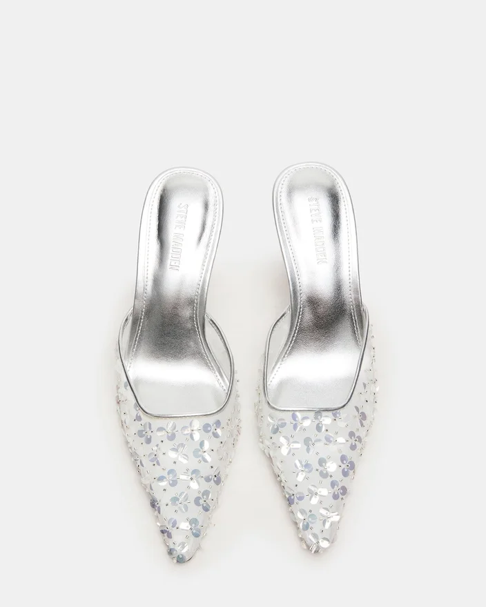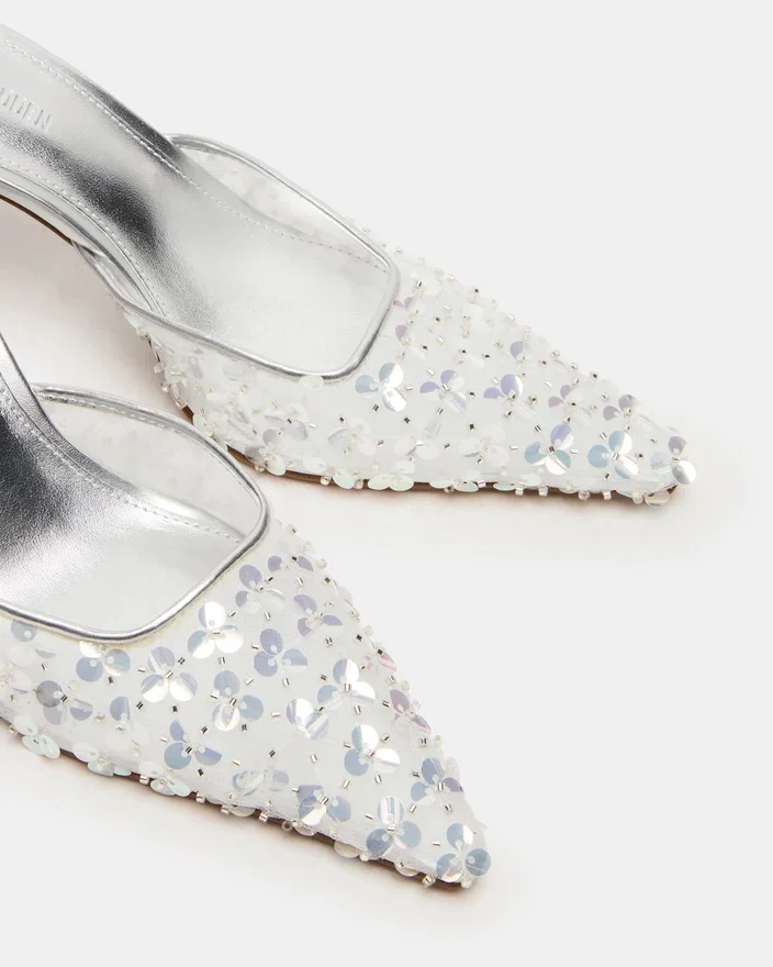 Îmbogățiți-vă colecția de încălțăminte cu modelul Alexi Sequin Silver, o pereche sofisticată de pantofi cu toc înalt și vârf ascuțit. Realizați cu detalii de calitate superioară, acest model versatil îmbină stilul contemporan cu confortul la mers.