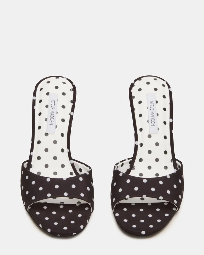 Realizate din materiale de lux, pantofii cu toc tip mule Kendrix, în alb-negru cu buline, au un design cu vârful rotunjit pentru un plus de confort și eleganță. Perfecți pentru orice ocazie, acești pantofi cu toc completează cu ușurință orice ținută, conferindu-i o notă de rafinament.