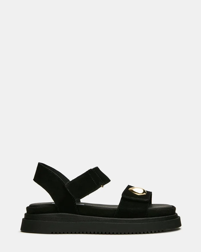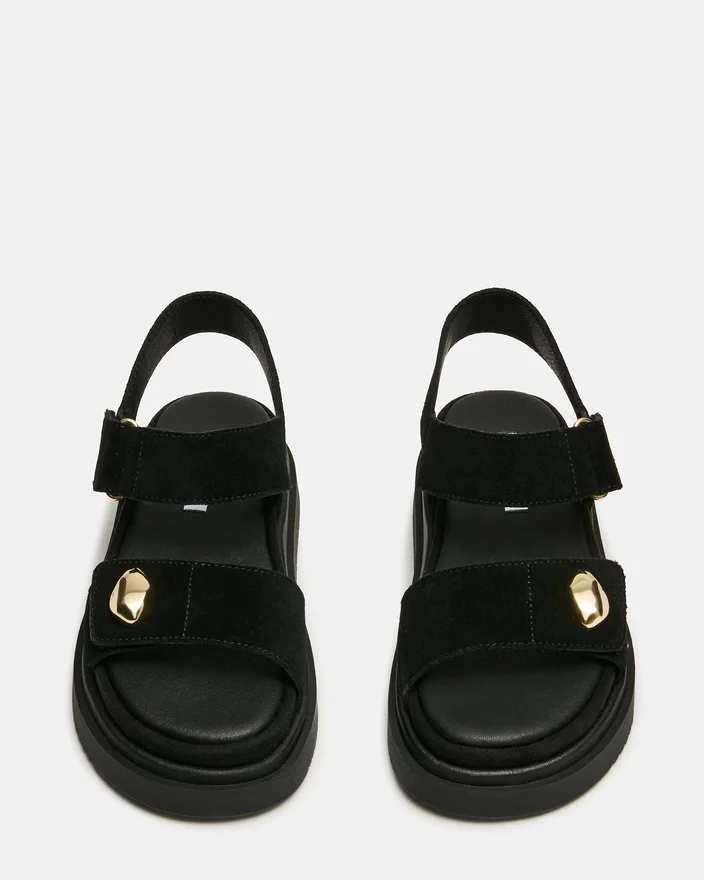 Îmbogățiți-vă garderoba casual cu această sandală sofisticată cu platformă din piele de căprioară neagră Matine, concepută atât pentru stil, cât și pentru confort. Talpa interioară căptușită oferă susținere pe tot parcursul zilei, în timp ce cureaua reglabilă cu velcro asigură o potrivire sigură și personalizabilă. Detaliile metalice rafinate în nuanțe aurii adaugă o notă de lux designului minimalist. Perfectă pentru trecerea fără efort de la zi la seară, această piesă versatilă se asortează perfect cu orice, de la blugi la Rochii.