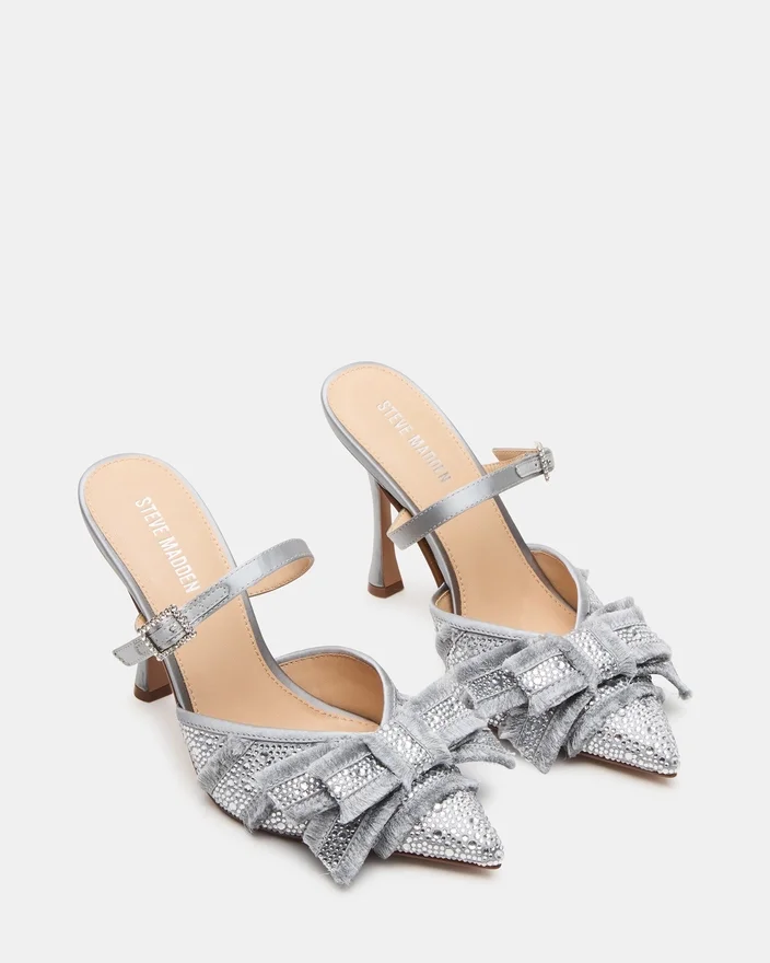 Îmbunătățiți-vă stilul cu pantofii Baylin din satin gri cu strasuri, care au un toc stiletto elegant ce oferă o siluetă sofisticată. Designul elegant al fundiței adaugă o notă delicată, în timp ce vârful închis și ascuțit accentuează aspectul rafinat al încălțămintei. Creați pentru a combina farmecul atemporal cu un aspect modern, această încălțăminte este perfecțiă pentru ocazii formale sau pentru a face impresie la orice eveniment.