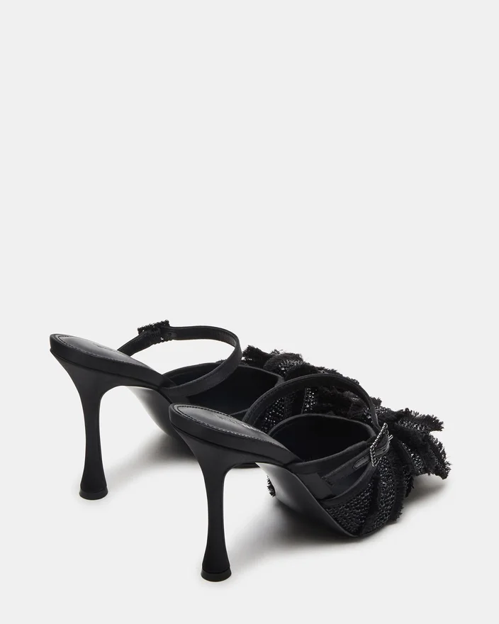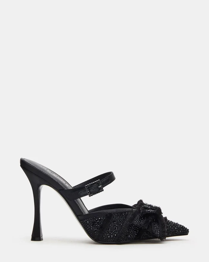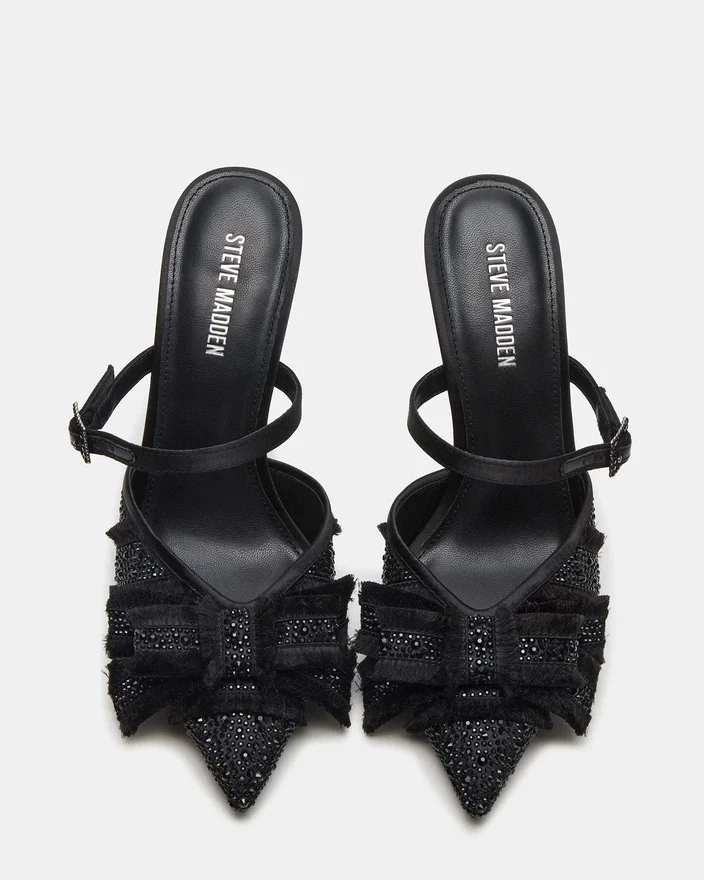 Îmbunătățiți-vă stilul cu modelul Baylin din satin negru cu strasuri, dotat cu un toc stiletto elegant care oferă o siluetă sofisticată. Designul elegant al fundei adaugă o notă delicată, în timp ce vârful închis și ascuțit accentuează aspectul rafinat al încălțămintei. Creat pentru a combina farmecul atemporal cu atracția modernă, această încălțăminte este perfectă pentru ocazii formale sau pentru a face o impresie la orice eveniment.