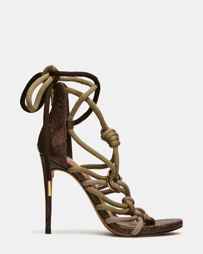 Modelul Catnyss Olive prezintă un toc stiletto impresionant, pus în valoare de detalii complexe de frânghie și noduri care înfășoară piciorul. Acest design arhitectural transformă o siluetă clasică într-o piesă de efect, combinând măiestria rafinată cu un aspect vizual îndrăzneț. Construcția cu legături pe picior oferă o potrivire personalizabilă, adăugând în același timp un plus de stil. Perfect pentru cei care apreciază încălțămintea care îmbină eleganța cu elemente de design distinctive.