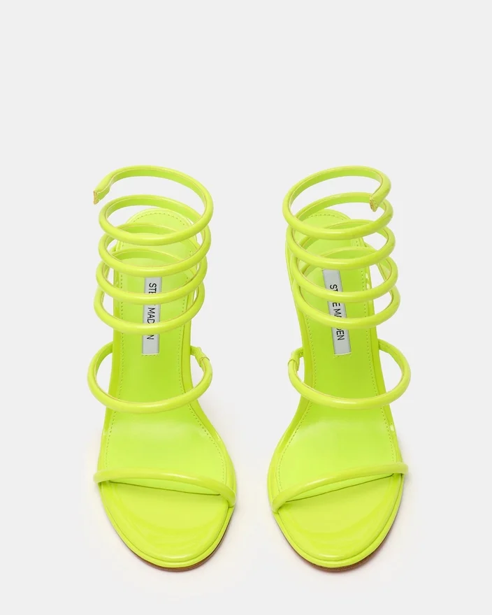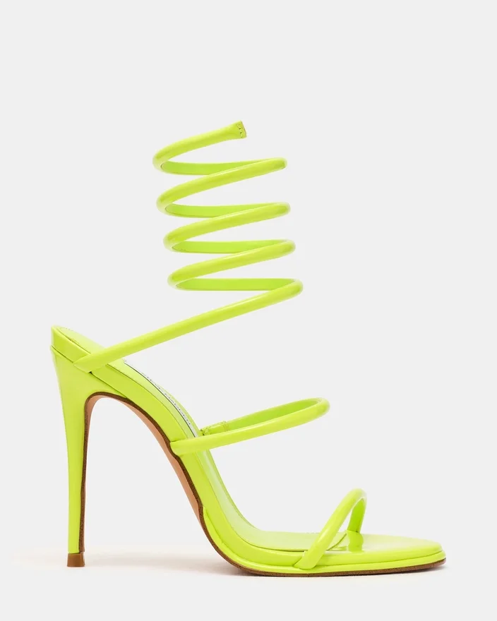 Adaugă o notă de lux garderobei tale cu Exotica Lime Patent. Această sandală cu toc stiletto și curele care înfășoară piciorul oferă un aspect și o senzație unice, care ies în evidență în orice mulțime.