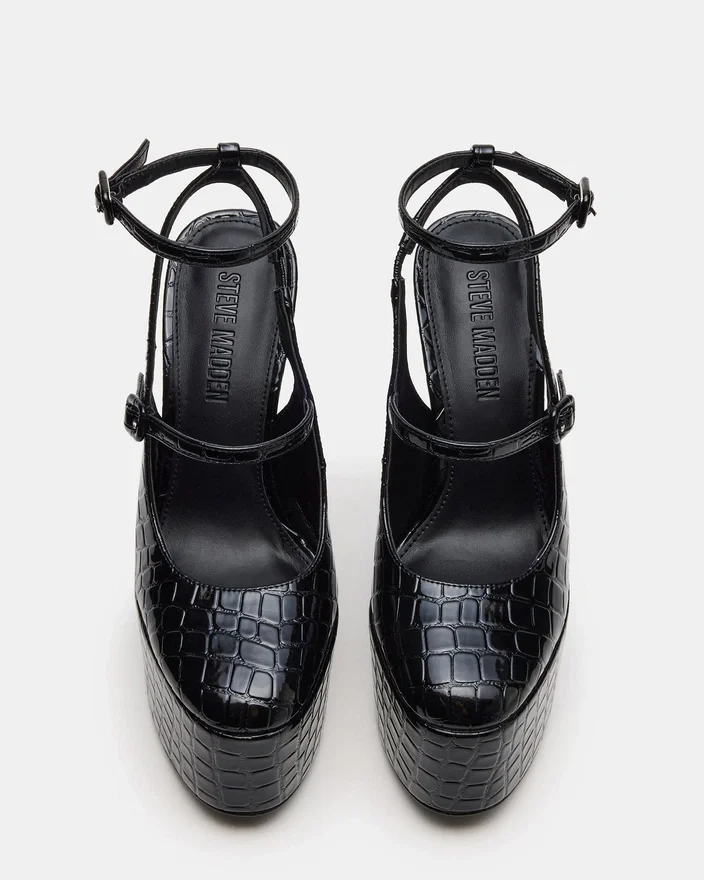 Îmbunătățiți-vă stilul cu pantofii cu toc Scotlyn Black Crocodile. Cu un design cu curele și un toc gros cu platformă, acești pantofi oferă atât confort, cât și un aspect elegant. Cureaua de la gleznă adaugă un plus de susținere și stabilitate. Perfecți pentru orice ocazie, acești sandali sunt un element indispensabil în garderoba dumneavoastră.