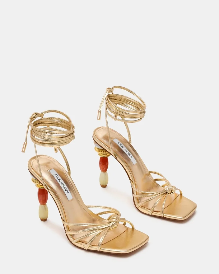 Solena Gold este un pantof cu toc și curele, cu o siluetă sculptată și vârf pătrat arhitectural. Designul cu legătură la picior creează o potrivire elegantă și ajustabilă, care pune în valoare glezna, oferind în același timp versatilitate de stilizare personalizabilă. Structura rafinată a tocului oferă un sprijin sigur și o estetică rafinată, potrivită pentru ocazii speciale și ținute contemporane.
