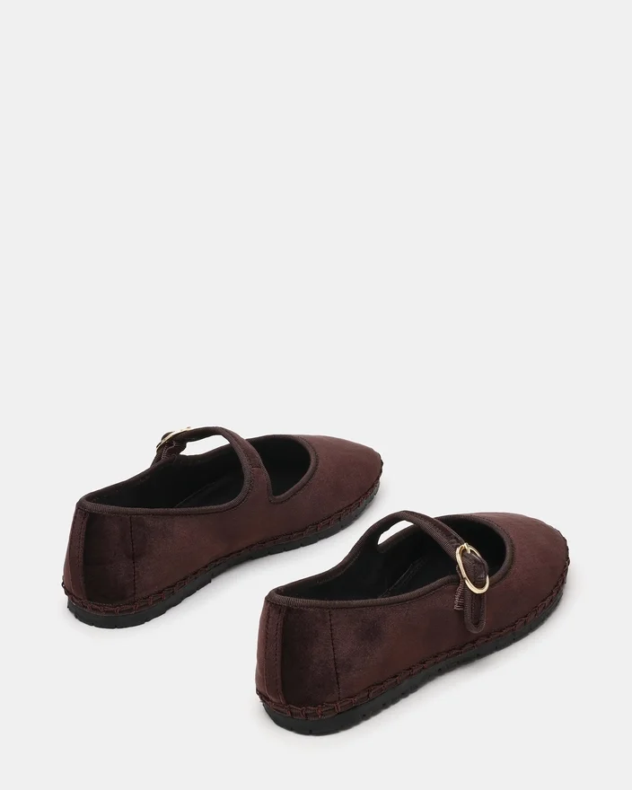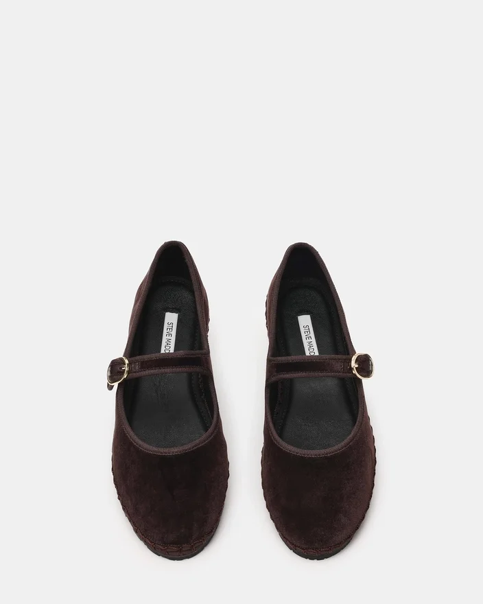 Modelul Velma din catifea maro prezintă o siluetă Mary Jane atemporală, îmbunătățită cu o închidere sigură cu cataramă. Acești pantofi fără toc oferă un confort rafinat pentru a fi purtați toată ziua, având vârful rotunjit și un design clasic al curelei care se asortează fără efort cu orice ținută. Detaliul cataramei adaugă o notă de rafinament, asigurând în același timp o potrivire personalizabilă. Perfect pentru cei care caută un pantof versatil și elegant.