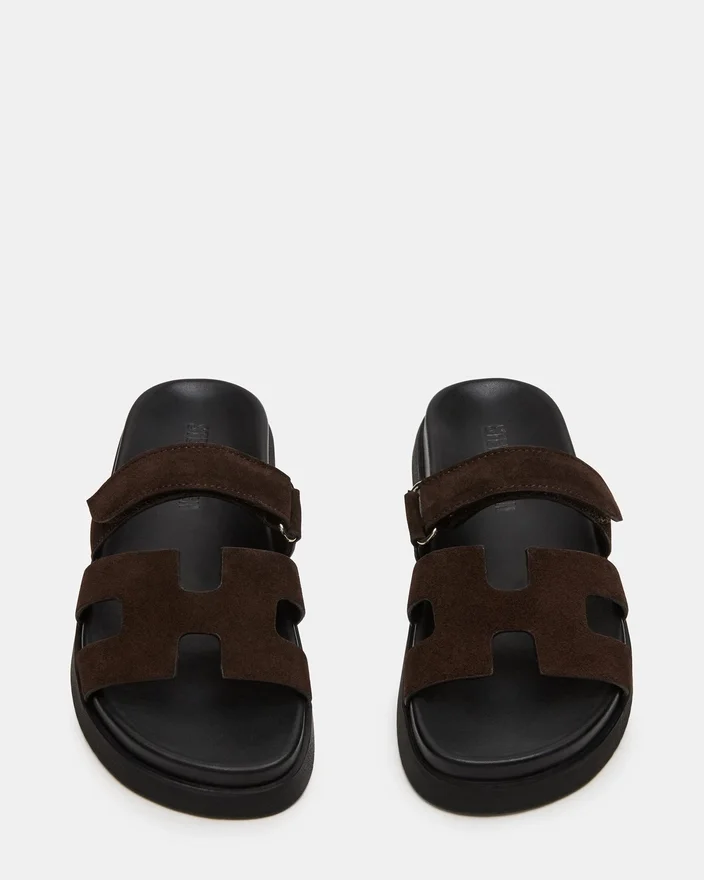 Papucii Mayven din piele de căprioară maro ciocolatiu prezintă detalii de construcție confortabile, precum talpă interioară modelată, talpă plată cu profil și o curea superioară reglabilă, plus o curea frontală cu un design geometric decupat.